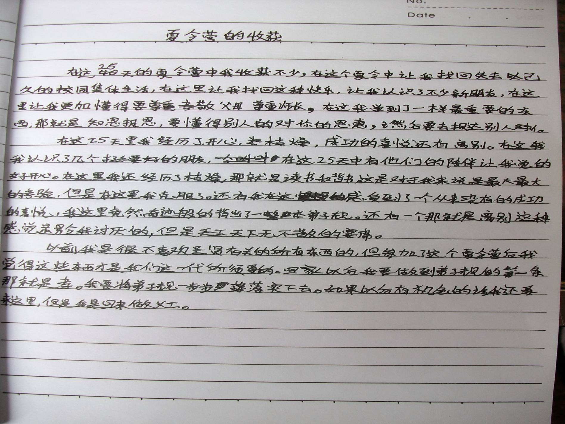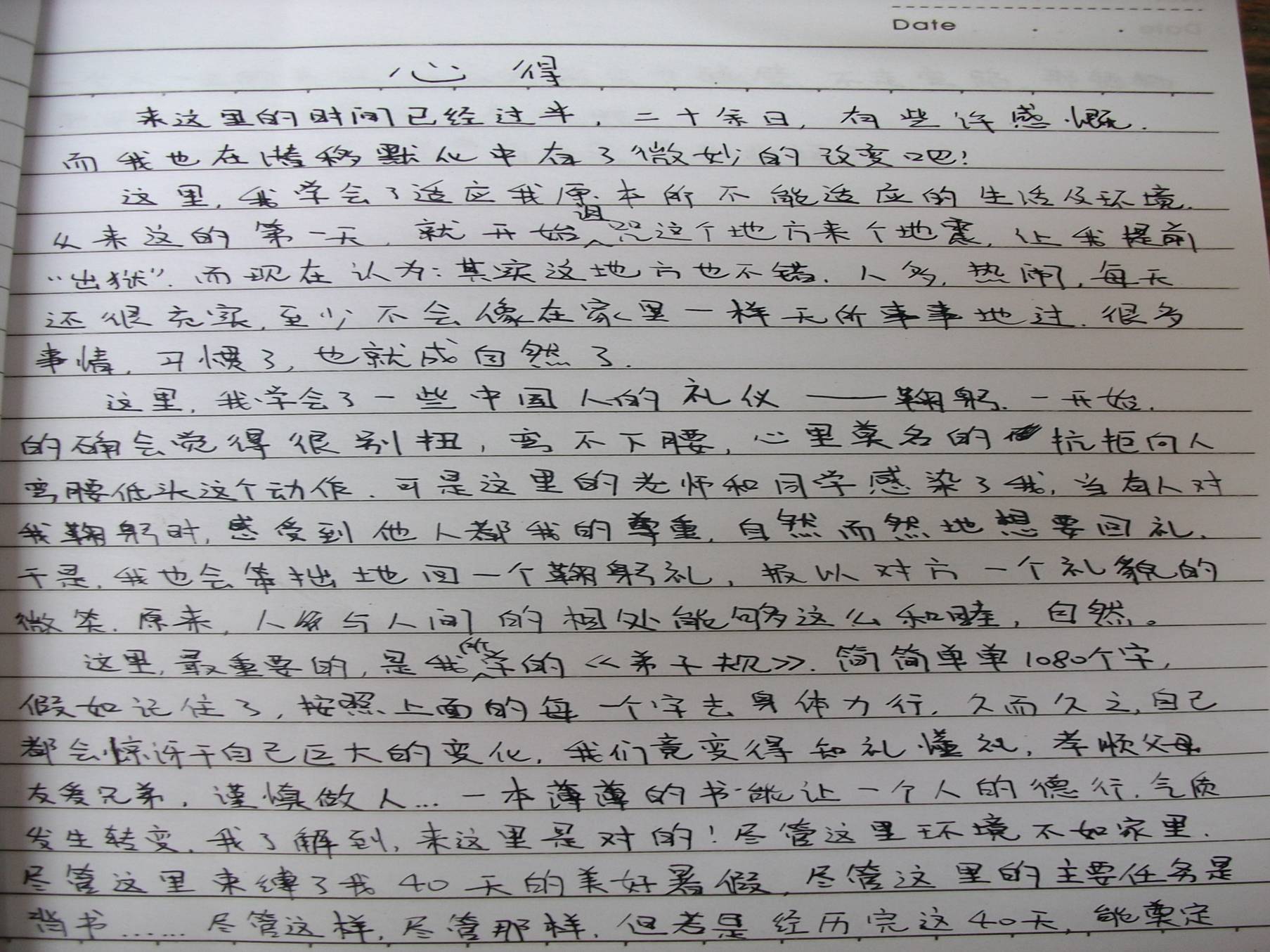09年夏令营在寒热的夏季举办,起初很多孩子来到这里对此地充满了怨恨(抱怨这里的环境没有家里好,抱怨着父母剥夺了自己的假期,抱怨着这里天天读四书五经......等等)。经过了短短40天的学习,孩子的思想有了极大的转变。抱怨变成了感恩,面对四书五经再也不觉的空乏无谓。